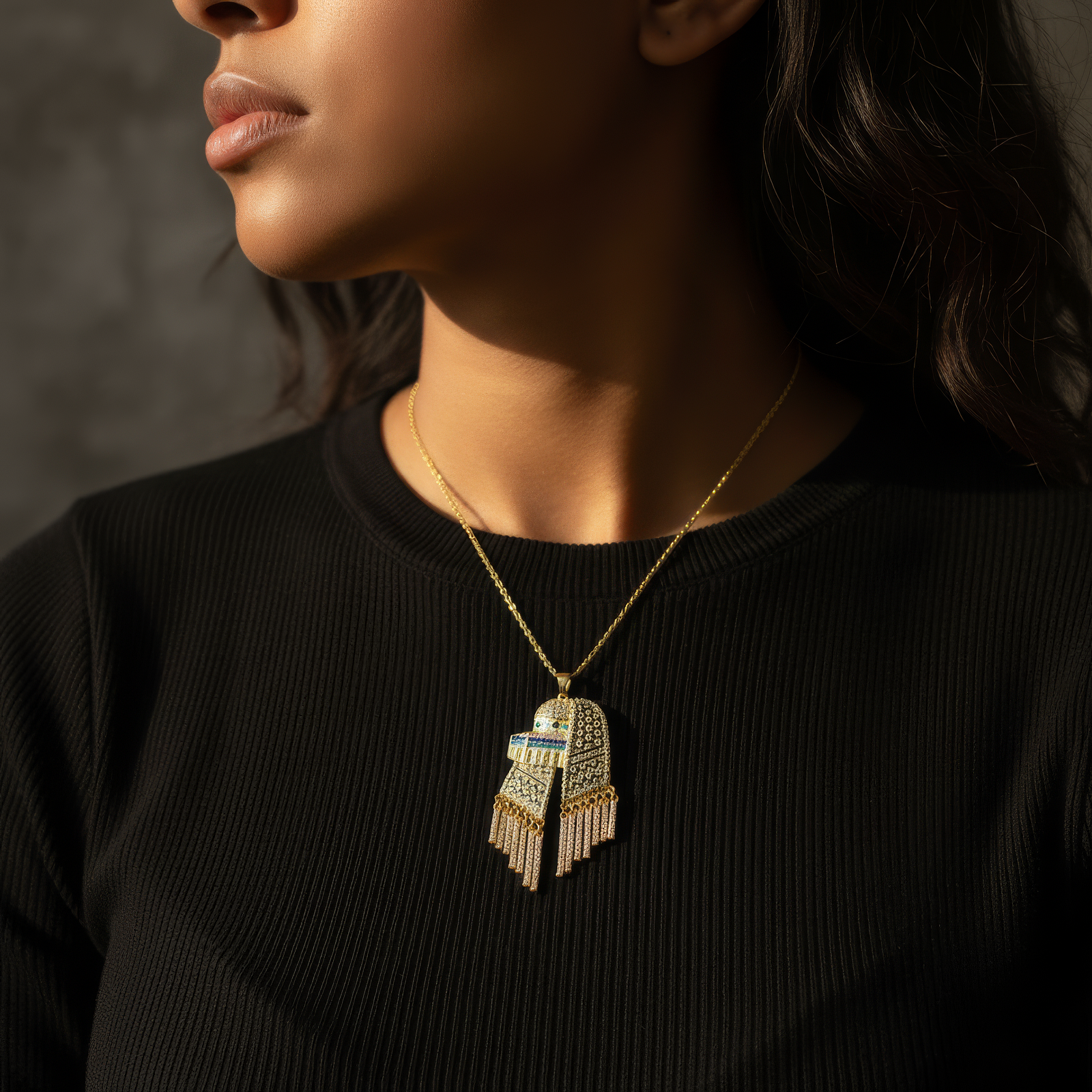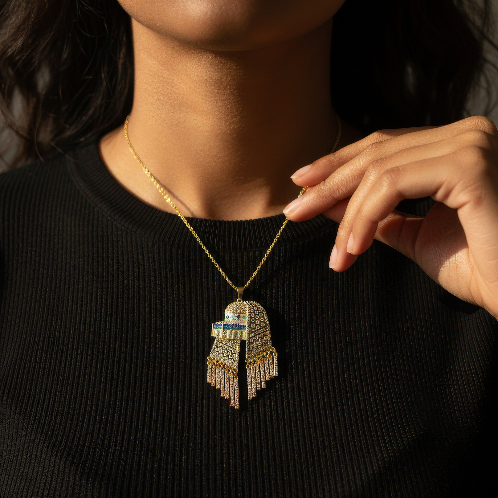 Entdecken Sie unsere exquisite Halskette, eine Hommage an das kulturelle Erbe und den Geist der Resilienz. Dieses wunderschön gestaltete Stück präsentiert das ikonische Kuffiyeh-Muster, das für Solidarität und Identität steht.