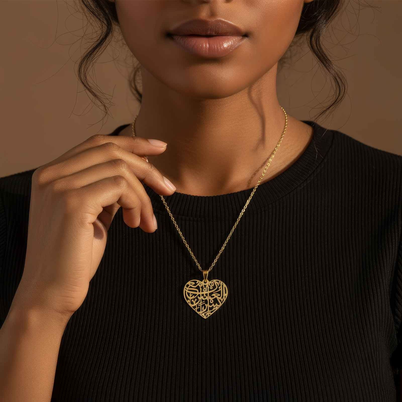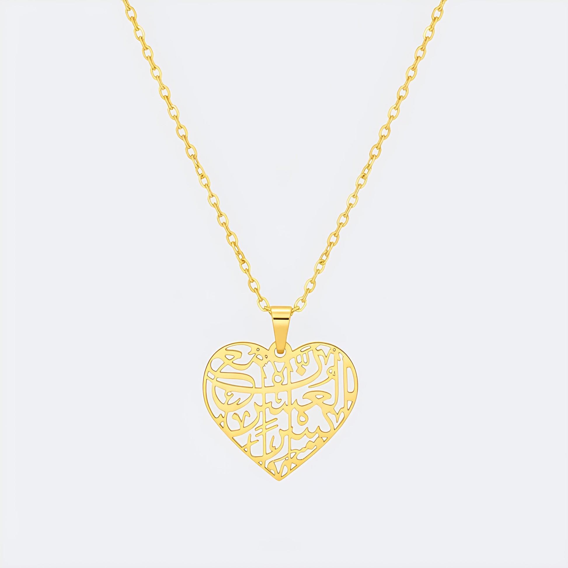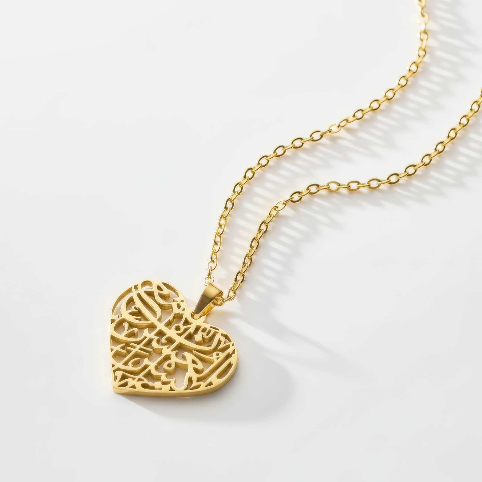 Entdecken Sie unseren goldenen Herzanhänger, verziert mit heiligen arabischen Schriftzeichen, der Allahs Worte nah an Ihrem Herzen hält.