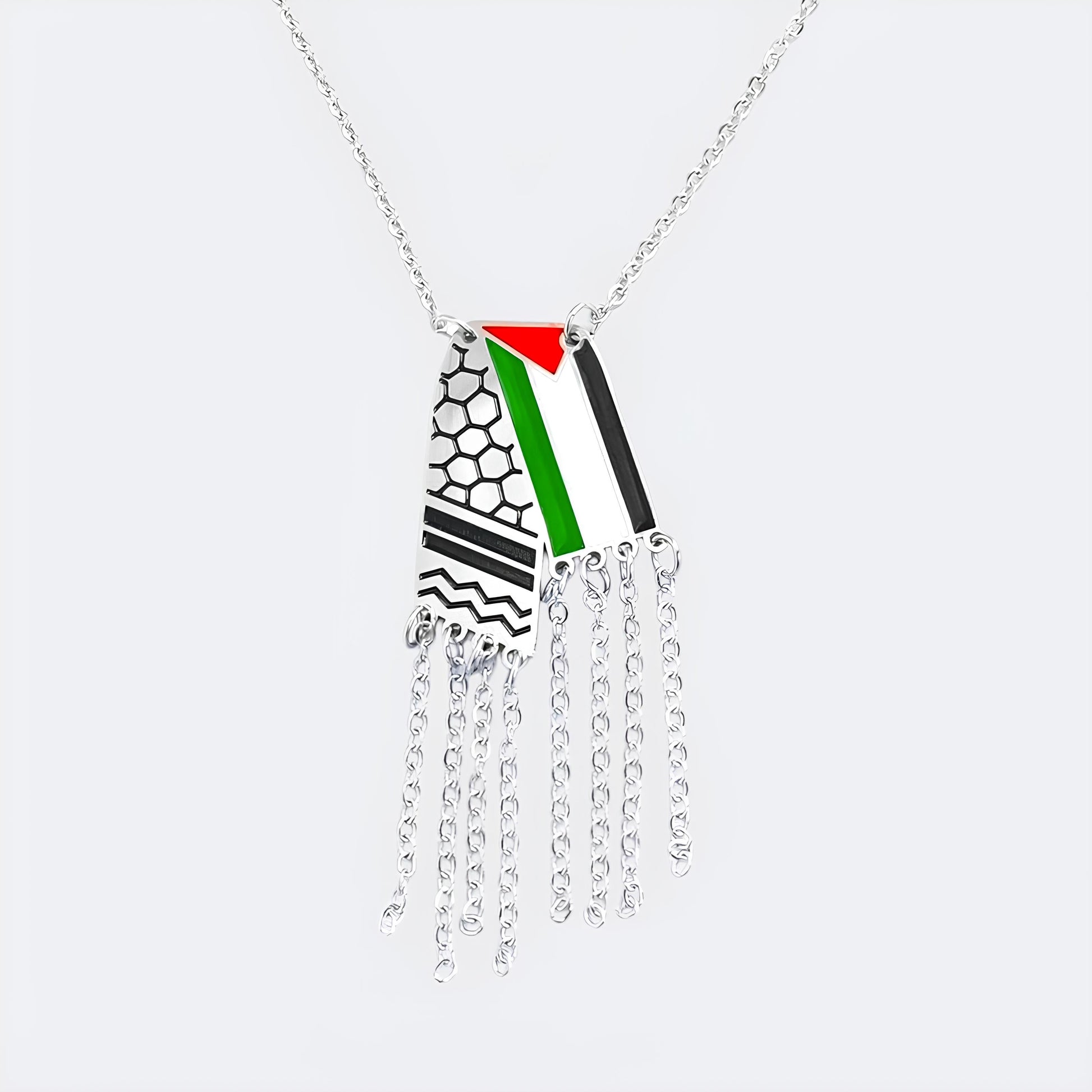 Ein Symbol für Widerstandsfähigkeit, Erbe und Einheit: Das silberne Keffiyeh-Halsband verkörpert den Geist Palästinas und ist reich an Bedeutung und Tradition.